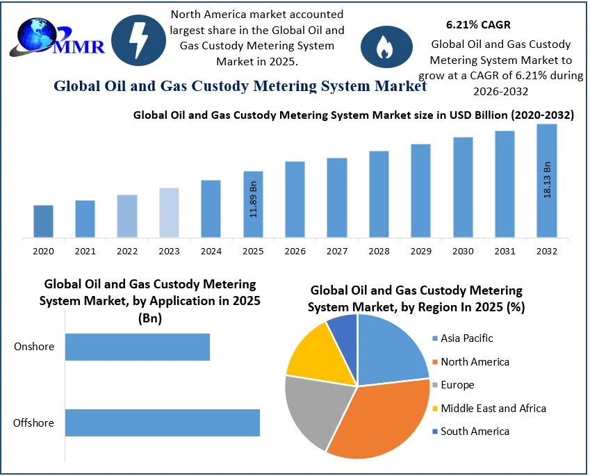 According to a new report published by Maximize Market Research, titled, “Oil and Gas Custody Metering System Market by Component, Application, and Region: Global Opportunity Analysis and Industry Forecast, 2025-2032”. The report provides a detailed analysis of the top investment pockets, top winning strategies, drivers & restraints, market size & estimations, competitive landscape, and regulatory compliance trends. Global Oil And Gas Custody Metering System Market size was valued at USD 11.89 billion in 2025, and is projected to reach USD 18.13 billion by 2032, growing at a CAGR of 6.21% from 2026 to 2032.