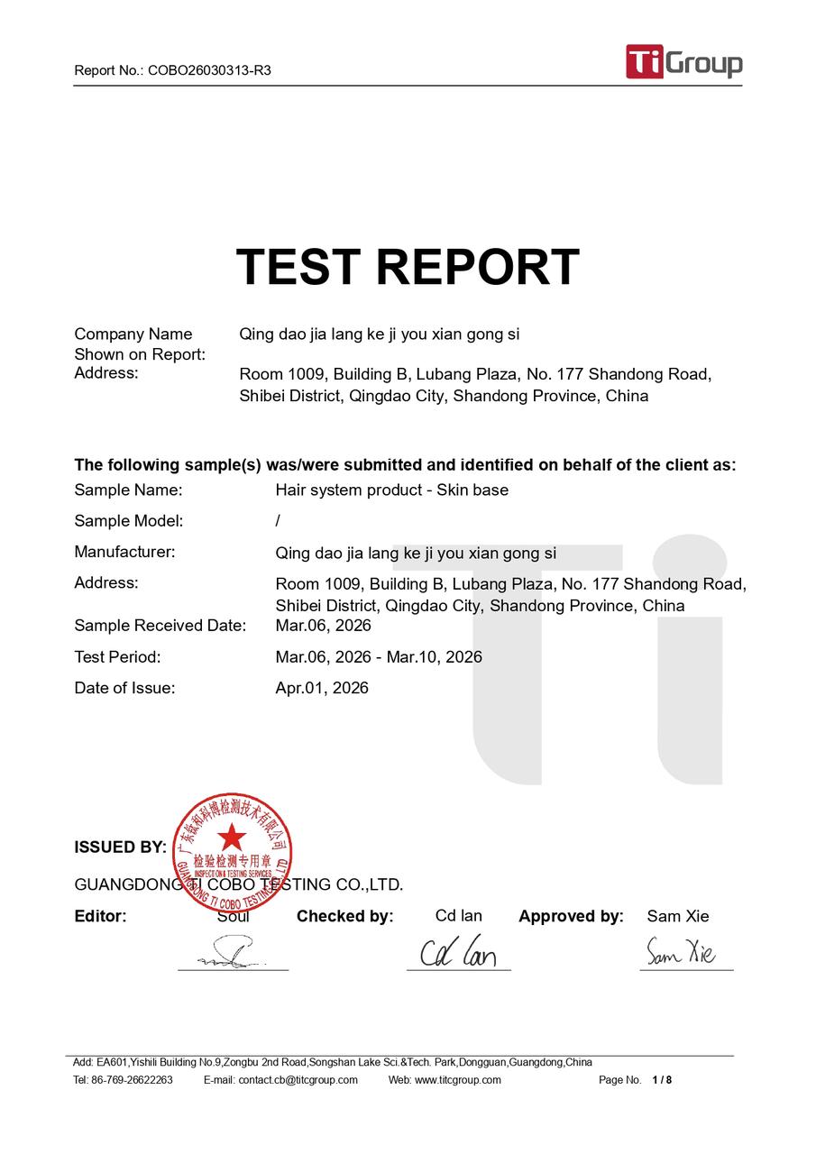 According to the test report issued on Apr. 1, 2026, Bono Hair’s skin base systems met all required standards across multiple categories: