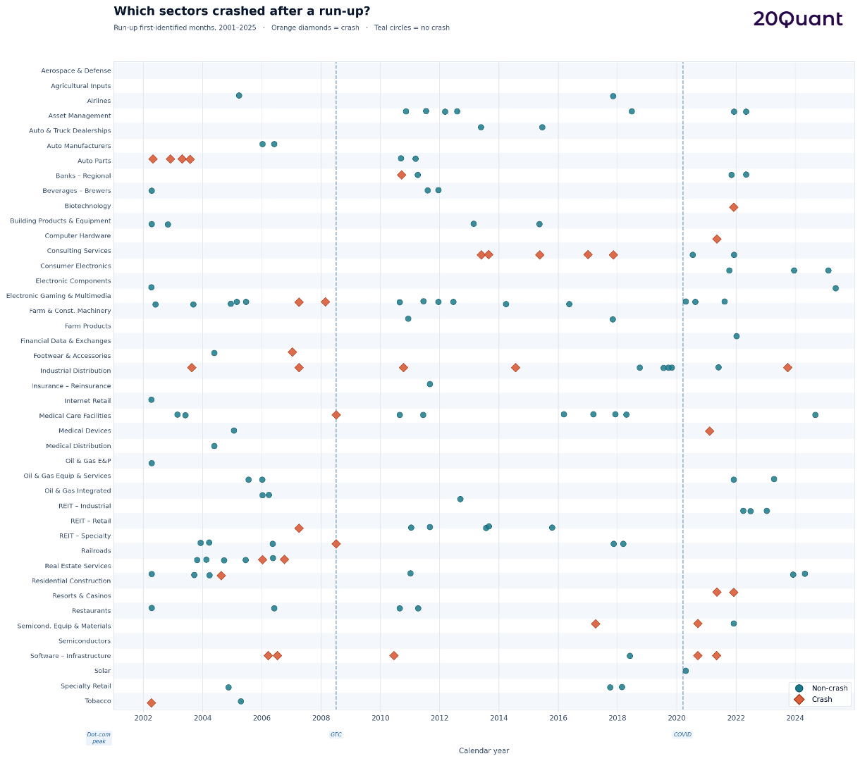 Before entering production, the GSY completed 20Quant’s full development pipeline: study of the academic literature, mathematical reconstruction of the formula, code development, testing, and validation of outcomes across 127 sector run-up episodes identified in the S&P 500 between 1986 and 2025.